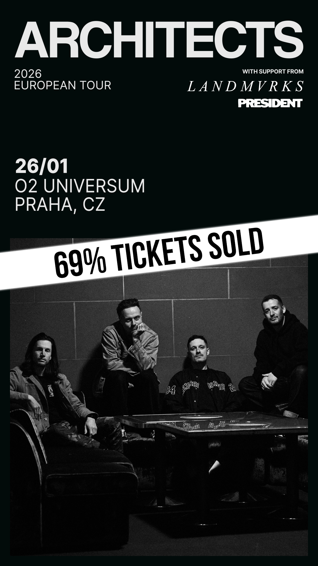 Architects se vrací do Prahy! Po vyprodaném Fóru Karlín zvyšujeme laťku a v lednu 2026 si tyto velikány metalcoru vychutnáte v pražském O2 Universu! Pro Architects se jedná o největší headline show, kterou tato britská parta v České Republice kdy odehrála, tak u toho buďte s námi! O tučný support se postarají francouzi LANDMVRKS a jedno z nejvíce diskutovaných jmen na světě, mysteriózní PRESIDENT.